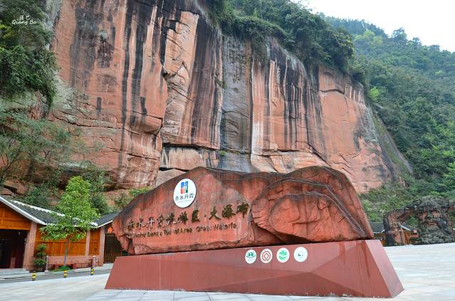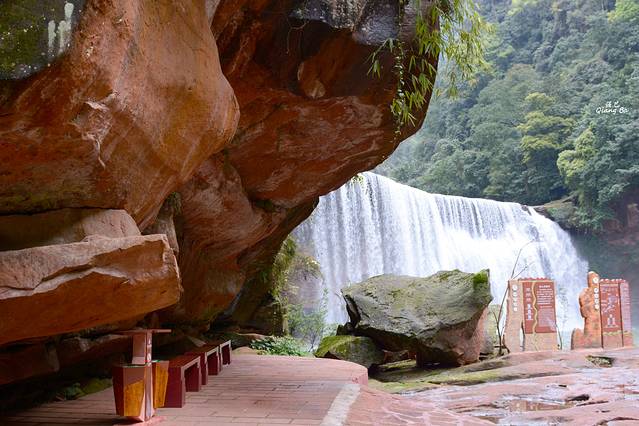 赤水大瀑布景区就在两河口镇,从住处走十分钟即到景区,景区入口处为一面高40多米宽60多米的丹霞石壁,又叫红色大瀑布。