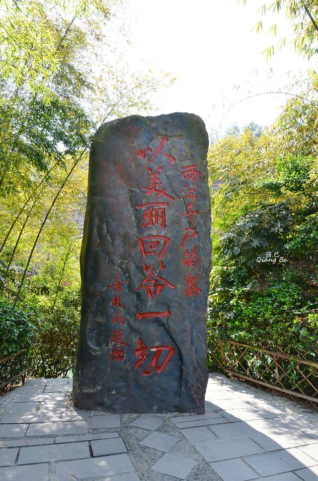 河边余秋雨题词“以美丽回答一切”的石刻,2012年时题字只是用红油写在石上,现在变为石刻。