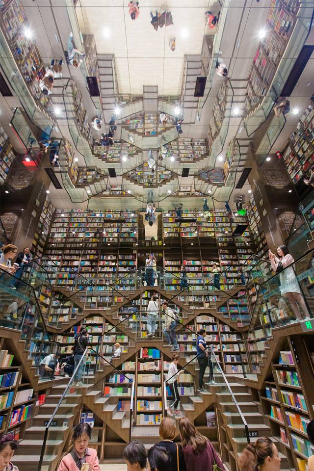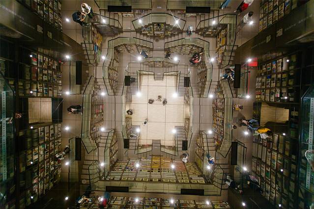 独特的玻璃顶设计,像蜘蛛网一样,人们好像网上的小蜘蛛,沿着玻璃的方向寻找自己想读的书。灯光和氛围,都给人一种不在真实世界的感受。来重庆已经很多次产生这样的感受了。