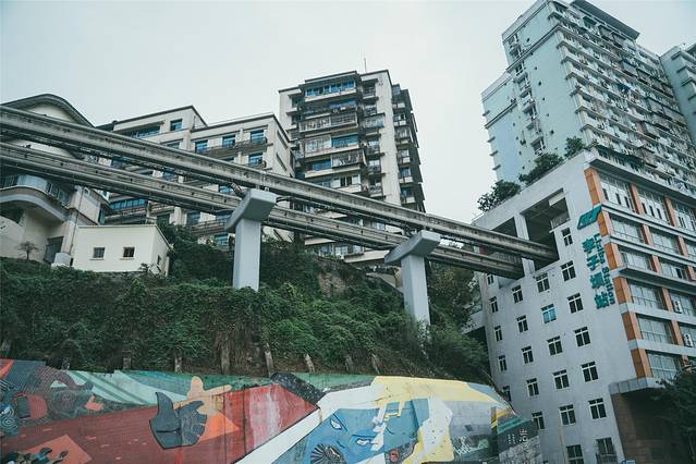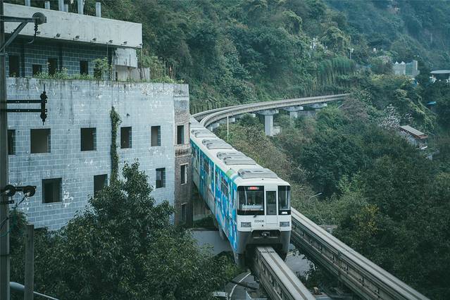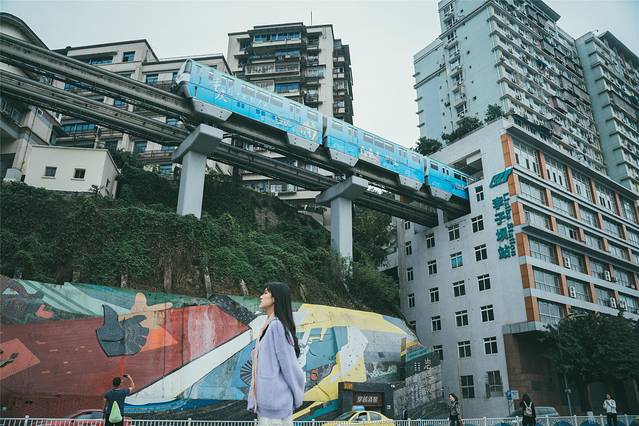 轻轨穿过楼房,高低落差给人一种“魔幻”的感受