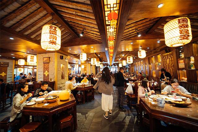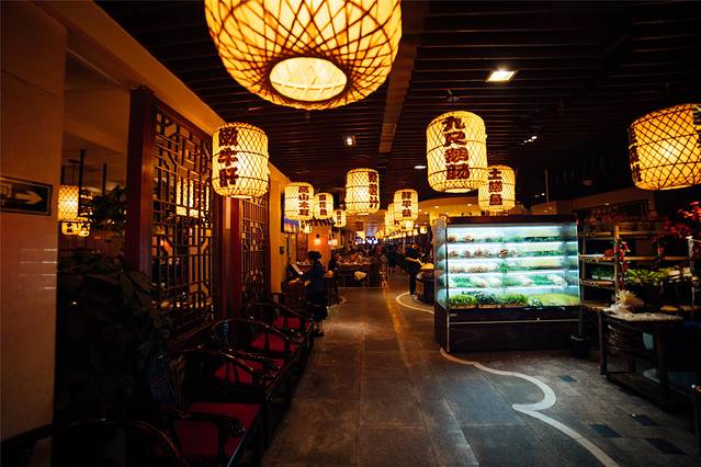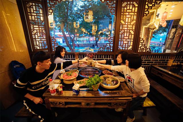 店内是中式的装修,古色古香的,很大气,非常宽敞,想象一下,外面是灯火辉煌的洪崖洞,你坐在这样的大厅里吃着火锅,好像自己也是身处故事或者动漫电影里的一个小角色