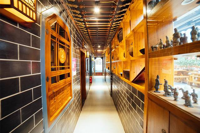 店里的装修颇有民国的风味,整个餐厅木质结构搭配暖色灯笼,很有感觉。黄色的灯给人一种温暖温馨的调调。墙上还有一些川式的摆件。