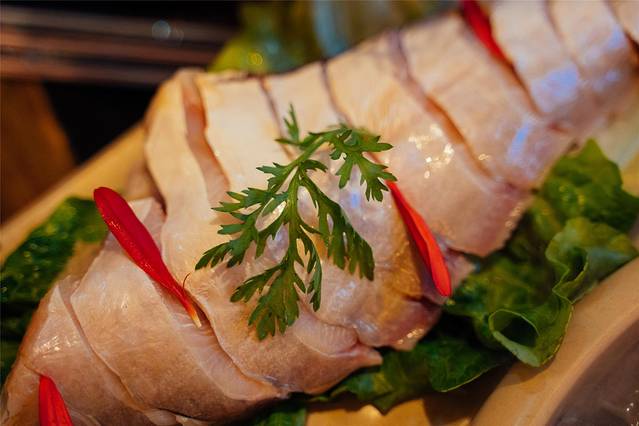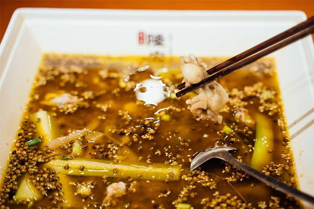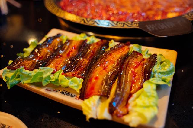 现划土鳝鱼,非常新鲜剔透的鳝鱼,划开薄薄的一片,往滚烫的红油汤里过一下,再往油碟里滚一遭,肉质鲜美可口,营养价值很丰富,这个菜品也是很特别的,推荐大家试一试。