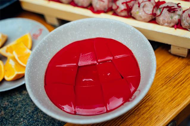 重庆特色的冰粉,里面有仙草、红豆、山楂、葡萄干、花生米和红糖之类的,吃完小龙虾来一碗,冰冰凉凉的好舒爽。