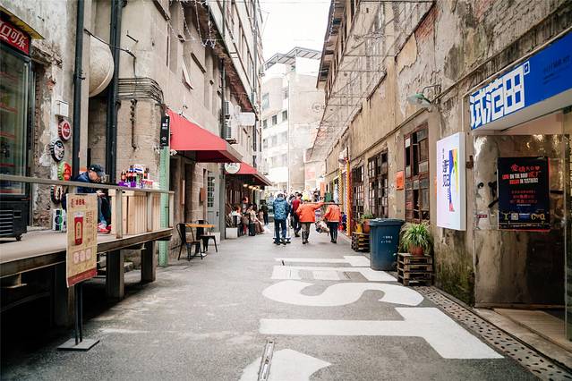 在二厂的街道上,能够看到几座老旧的工厂楼,这些过去的印记和现代风格的店铺结合在一起,反而颇有风味。自带老胶片的效果。