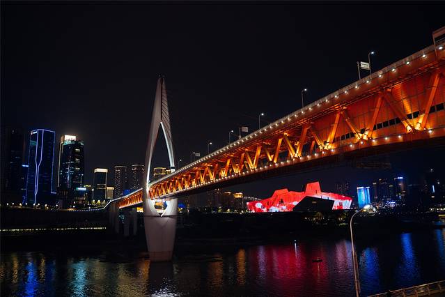 在岸边欣赏千厮门大桥的夜景,彩色的灯光好像通往另一个世界的秘密隧道。