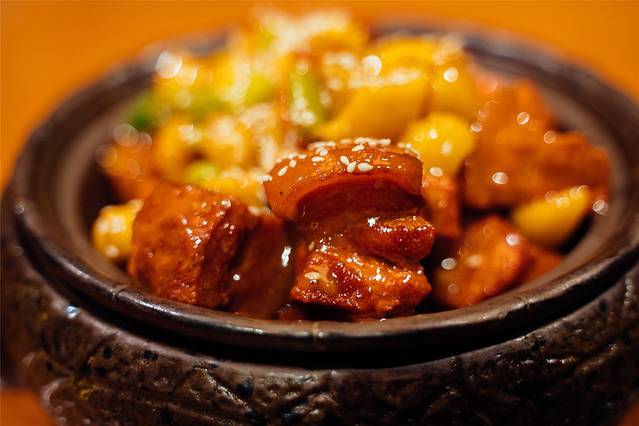 最后推荐他家的秘制酱烧肉,味道有点像红烧肉,是偏甜的口味!不辣,煮到的软糯肥嫩的猪皮和紧实的肉一起咬下去,汁水外溢,好吃的想尖叫。配上栗子甜糯的口感,真的非常和谐!