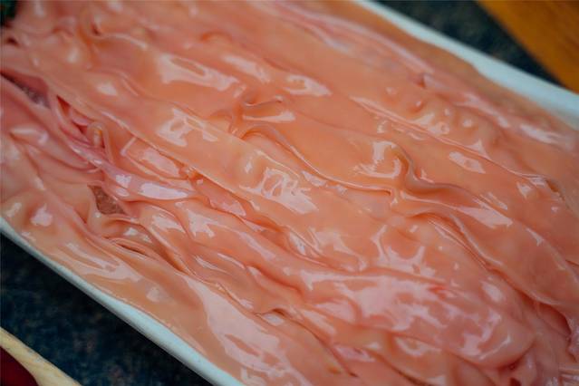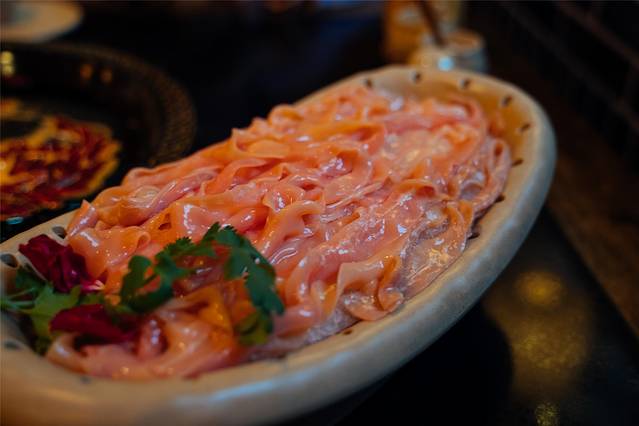 鲜美的肥羊卷,肥瘦相间,一口咬下去细腻的肉质瞬间充斥在整个唇间,瘦的部分带来鲜嫩的口感,肥的部分带来油脂的香味和细腻的口感,加上干碟,简直一绝。