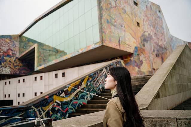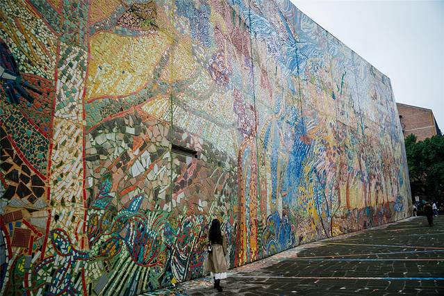 终于走到校区内的罗中立美术馆,一路走能看到墙上瓷砖砌成的马赛克涂鸦墙。还有地上的彩砖。
