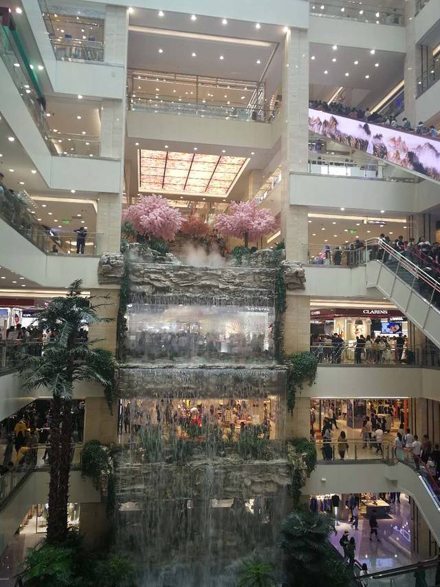 商场内部5层高的水系景观,第一次见,大众消费水平,人气很旺