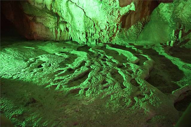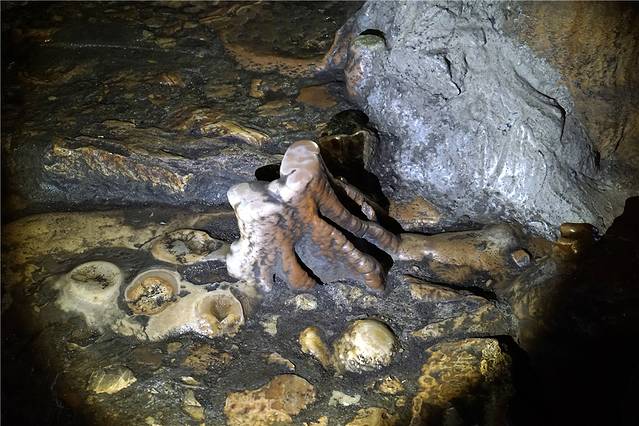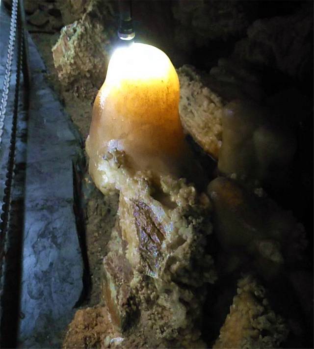 洞穴中除了司空见惯的石笋、钟乳石外,由于水的洁净度高,一些石头在灯光的照射下呈现出柔润的光泽,犹如黄玉。