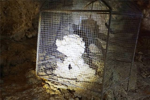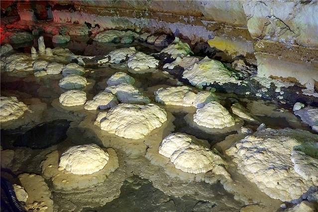 瑶池石莲也是一层的一个重要景观,奶白色的莲花状或蘑菇状、菜花状的石头看起来非常好看。这些由池水沉积而形成的月奶石,外表似乎很坚硬,实际上里面是粉末。据说月奶石是国宝,在我国洞穴中前所未闻首次发现。它的形成经历了3.4万年左右。