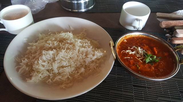 咖喱鸡肉饭,喝酥油茶和甜茶。酥油茶是咸的,甜茶嘛当然是甜的啦