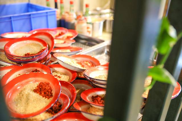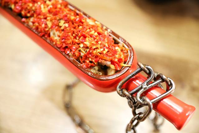 这道菜上来的时候是新鲜的生虾,厨师会拿一锅热油现场将虾烫熟,油倒下去一股香辣的香味就扑鼻而来。