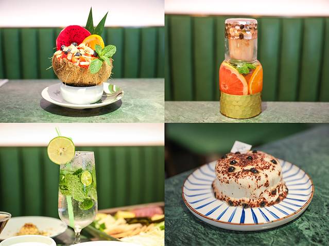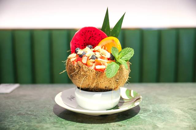 这应该算是一道饭后甜品,也可以作为中场休息的一道开胃小菜,为什么要中场休息?因为太好吃了,吃饱了还想继续吃!椰子壳做成的椰子碗,四周是西柚薄荷作为装饰,碗里是火龙果,芒果,椰片加上酸奶,十分的爽口。