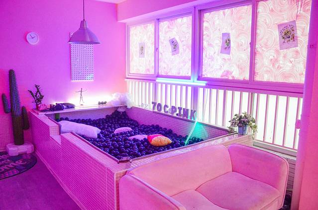 ⚡️集纹身 民宿 休闲于一体的粉色空间 从墙壁到纹身的床 超多粉色家具 公共空间的超大黑色泡泡池 ins风 七十度粉 集超多网红元素 随手一拍就是大片。