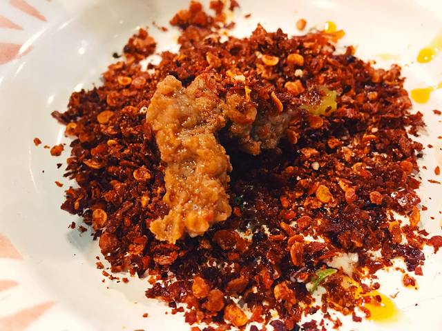 干碟配上牛肉,我的天那味道真的好吃极了,牛肉Q弹,辣椒面味道更好,真的是天生绝配。