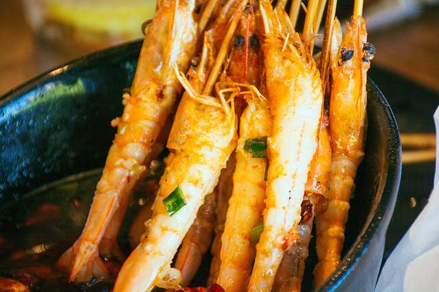 裸奔坨坨虾:不用亲自动手去掉虾壳,虾用签子串着,浸泡在香辣的汤汁里,即使没有人剥虾壳,也能一串接一串,根本停不下来。吃的时候一定要沾点这个汤汁哦;你以为把虾吃了就完结了吗?不!里面的芋儿大家记得捞一下,已经被煮的很香很软了,味道已经完全融入到了芋儿里面了,好吃极了,不要说了,此时的我有点流口水。。。