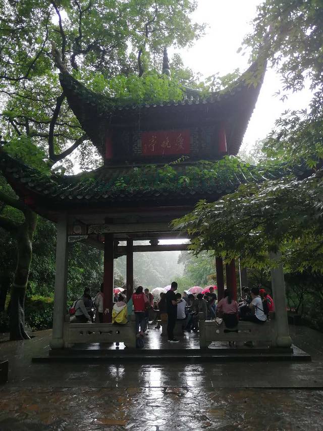 亭子里很多避雨的游客,匆匆拍完照离开。