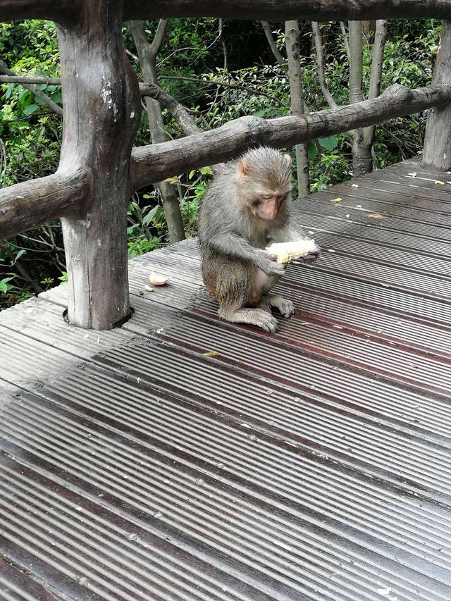 天子山上最有意思的是猴子,和峨眉山上的有一比,哈哈哈。因为我戴红帽,穿红衣,怕它扑上来就没靠近,然而啊,猴子忙着抢游客零食,根本没时间搭理我。