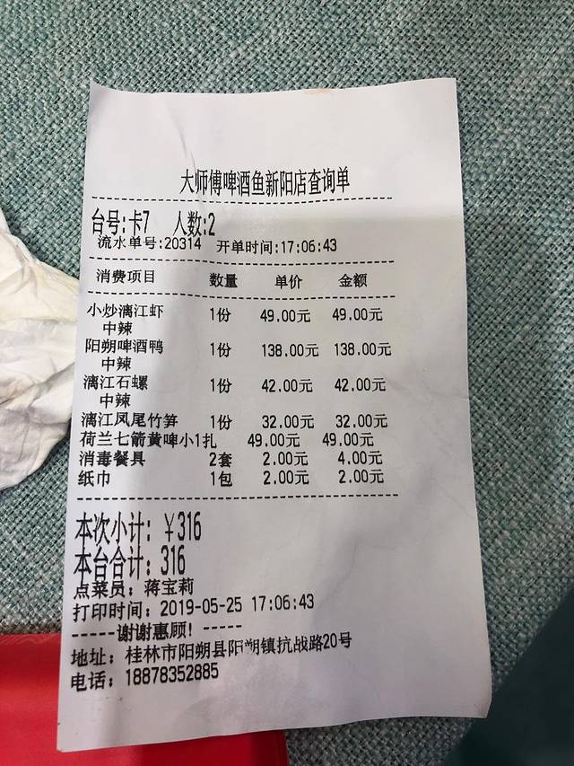 来阳朔,怎么可以不吃当地名菜啤酒鱼呢,阳朔的啤酒鱼可以说是满大街都是,其实只要大家选择一家门店比较正式的,味道都是差不多了,我在大众点评上选了谢大姐啤酒鱼,因为评分比较高,所以就定了,味道还可以,就是价格偏贵。服务员一直诱导我们单点,后面还怂恿我们点88元一斤的剑骨鱼,而且这种鱼都是很大的,我们的鱼是两斤半,我建议大家在大众点评上面直接选择套餐,价格实惠,后面服务员算错钱,还死鸭子嘴硬,以后我不会来。我之所以单点是因为跟着一个“不吃无鳞片鱼”的死丫头。
