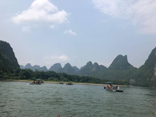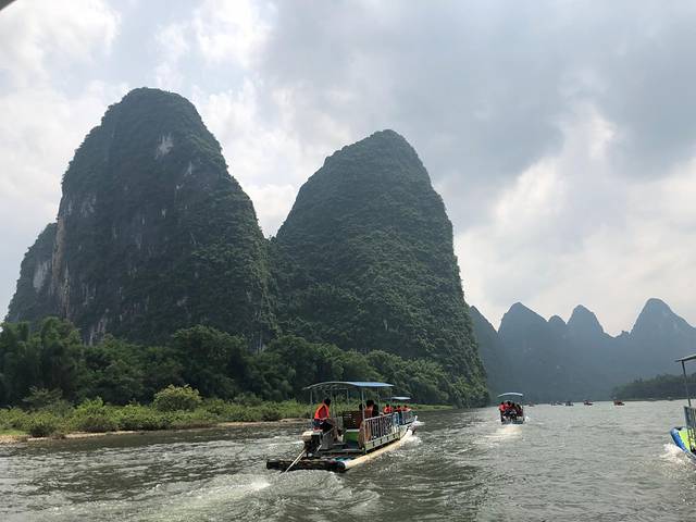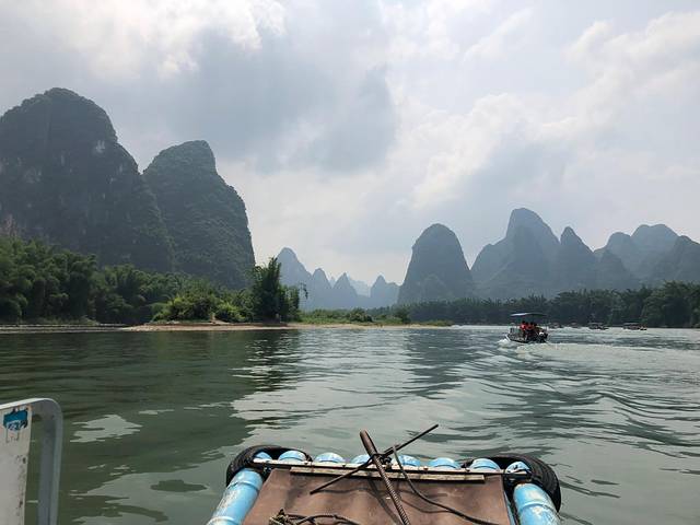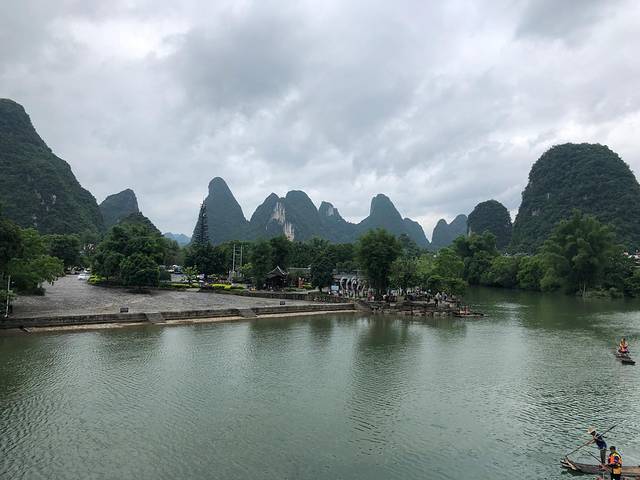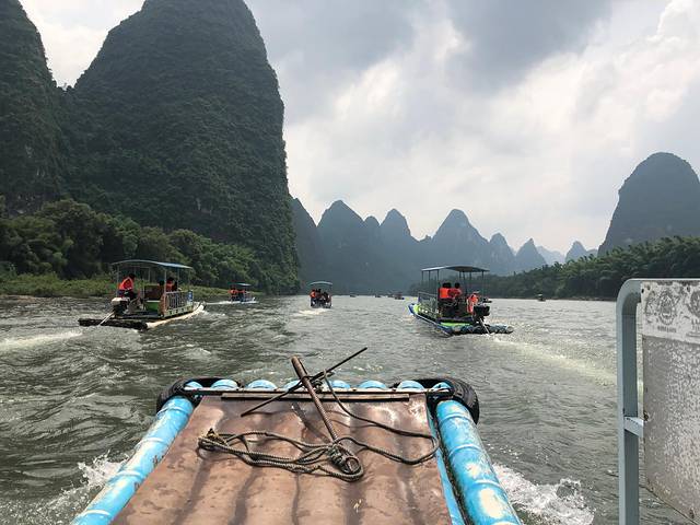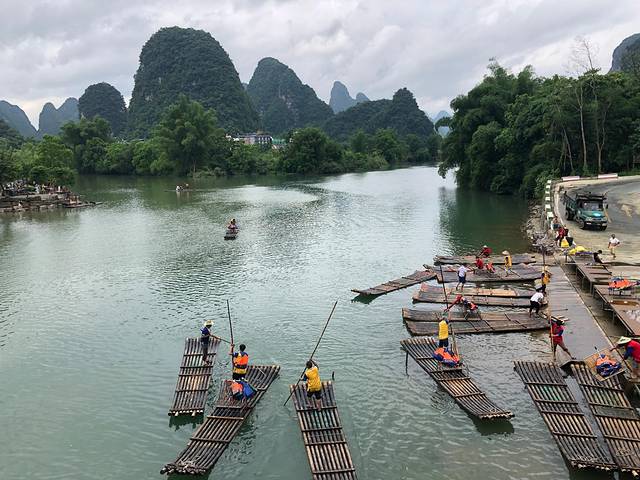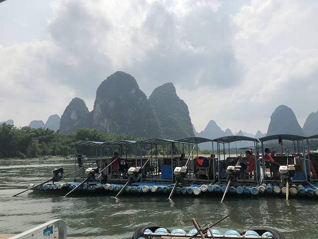 按时抵达!在这里我要给大家一个备注,首先阳朔站离阳朔县是有一段距离的,大巴线路需要一个半小时,所以是不近的,中间隔着一个兴坪镇,而兴坪镇本身并没有特别的小镇特色,它的精华之处便是它的码头可以坐木筏游览漓江,这才是绝妙之处,我们是提前预定的木筏,98元一位(含来去电瓶车),非常值,4人满了出发,如果是双人行的朋友,在这里得等下一波人凑个数,才出发,当然有钱的朋友,可以直接出4人份出发。