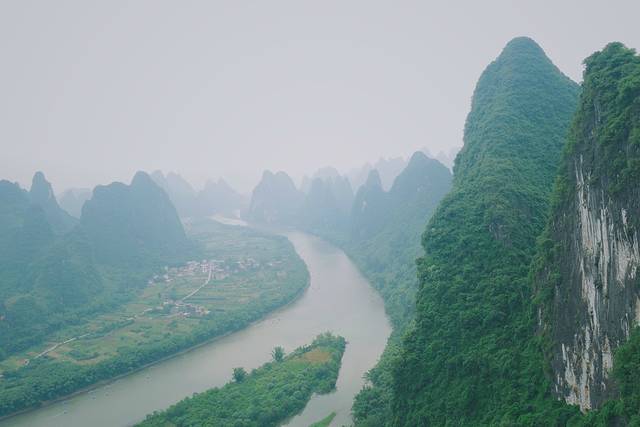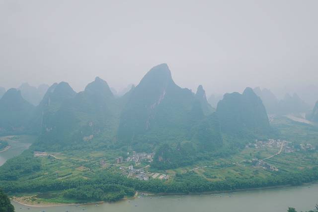 但一切负面的情绪在登顶的那一刻就会瞬间烟消云散,错落排列的群峰将桂林山水的喀斯特地貌展现的淋漓尽致,举目远眺,蜿蜒流淌的漓江静静躺在群山怀抱中,并大大地转了一个U型弯,形成了著名的“漓江第一湾”。