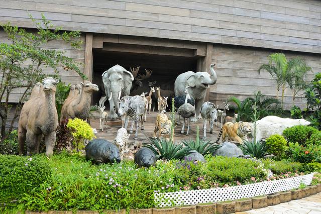 如其名,挪亚方舟来源于挪亚一家带领动物们一起搭上方舟避难,躲开大洪水后寻找新天地的神话传说。园区内也根据神话以1比1体积建造了巨型方舟,更在方舟花园内摆放了故事中被选上方舟的动物模型。