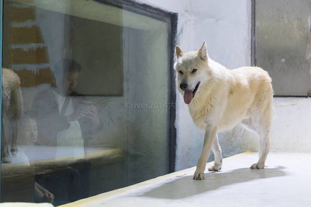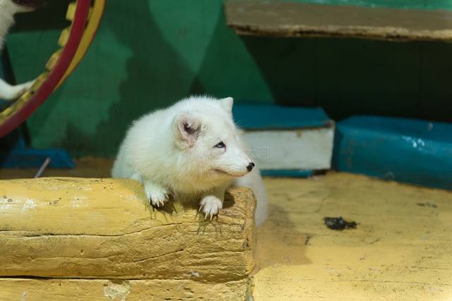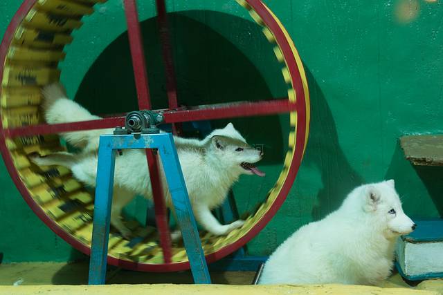 白色毛茸茸的北极狐,非常顽皮,会不自觉的跑到滚筒上转来转去,就像在健身房的跑步机上跑步一样。