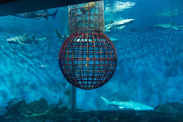 正在水中游的是鲨鱼,虽然体型并不太大,但性情凶猛,中间的笼子是为了喂养鲨鱼而特意设置的,工作人员需要进入到笼子里喂食以保护自身安全。