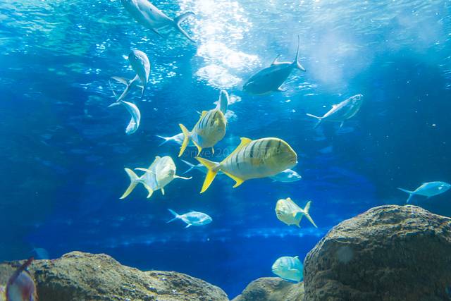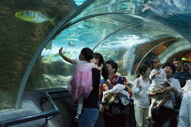 透过透明玻璃,游客对海底世界一览无余,仿佛漫步在海洋中,各种鱼在身边游来游去。