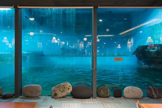 餐厅由巨大的落地窗,窗外的水中,白鲸游来游去,一边吃饭一边欣赏白鲸。