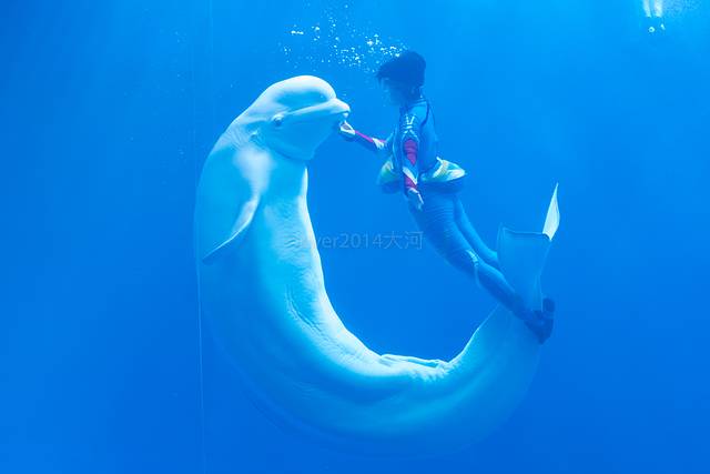驯养员与白鲸高度默契,不用穿戴任何防护用品就进入水中表演。