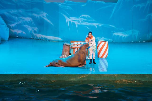 在驯养员的指挥下,海象就像一个孩子一样顽皮淘气,让游客掌声不断。