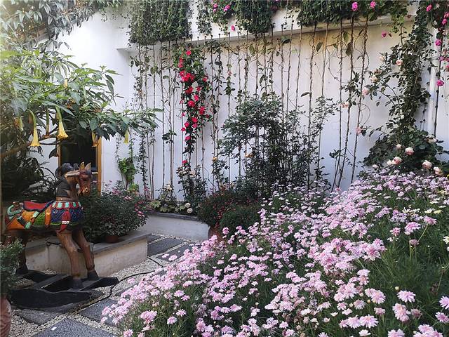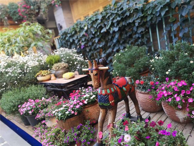 办好入住手续,来到院子里,真的是被眼前的美景惊到了,满院子的花开的正艳,还有萌萌哒多肉,在蓝天白云的映衬下显的分外妖娆。小木马也是院里的标配,我在好几个听花堂都看到了这个充满童趣的小摆件。而这里真正的特色刚是无论何时推开窗户或者走出门,都能看到这满园的花海,上百种的多肉和鲜花把整个院子铺的满满的,仿佛每个转眼都如同隔世的闪念。