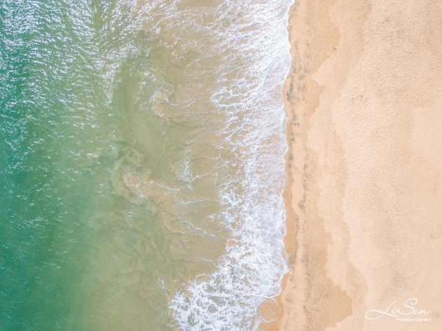 从空中欣赏大海是独特的。从小生活在海边,几乎随时都可以来到沙滩边上,倾听海浪的故事,但这也是我第一次从空中仔细欣赏洁白的浪花拍打海岸时留下的道道画作。