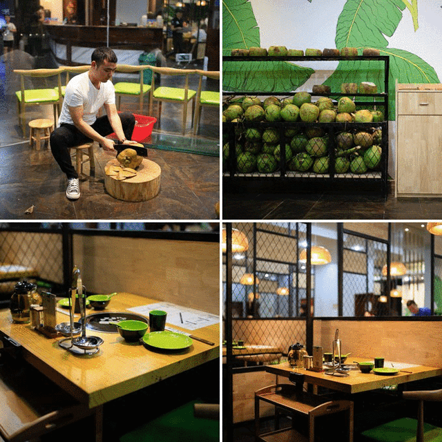 不愧是椰子鸡,一上来火锅里就倒入了满满两颗椰子汁,再配上专门从 文昌 运过来的 文昌 鸡,绝对的肉质饱满,再配上特色的椰子饭等美食,足以让你吃一顿美味的大餐。在自己调制调味料时,要记得加上一两个 小金 桔的汁水哦,会让椰子鸡的味道更加清爽。