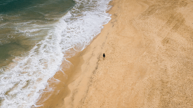 无人机逐渐高飞,海岸线的全貌开始在图传画面中不断延伸,沙滩变得似乎更加绵延不绝,大海也变得一望无际,远方的海岛山丘开始在层云间显得若隐若现。突然,一道阳光冲破了云层,洒落在海面之上。终于,邻近中午时分,真正的碧海蓝天逐渐展现在了眼前。