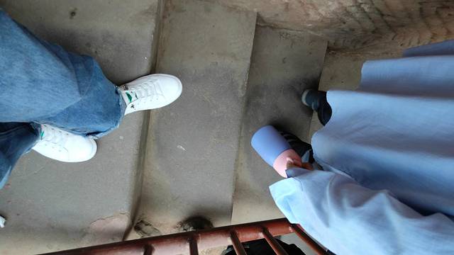 台阶有高三公分的,也有八九公分的,转弯处有横竖相交的,一定要注意脚下。