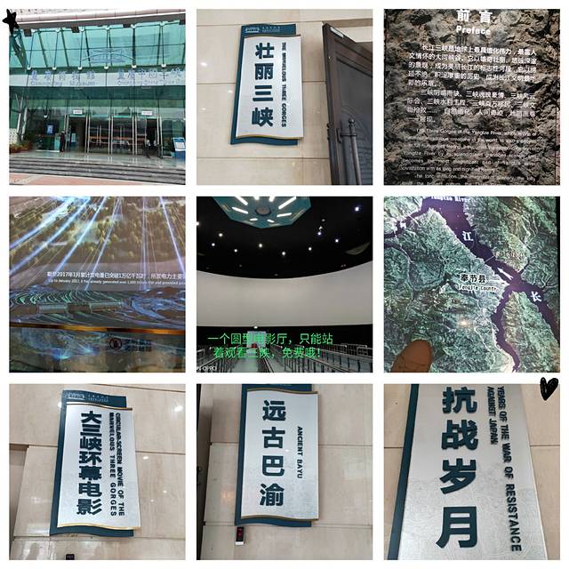 去不了三峡现场,便去三峡博物馆。这个馆是免费的,四层楼共十几个厅,够逛三个小时左右。馆里讲述三峡的由来及从古代到现在各位国人对三峡做出的贡献。电影播到哪个位置,下面的模型就亮灯。三峡展厅的地板是海洋,让你仿佛置身海中观看。几个厅地板都有三峡地图,文物出土等。
