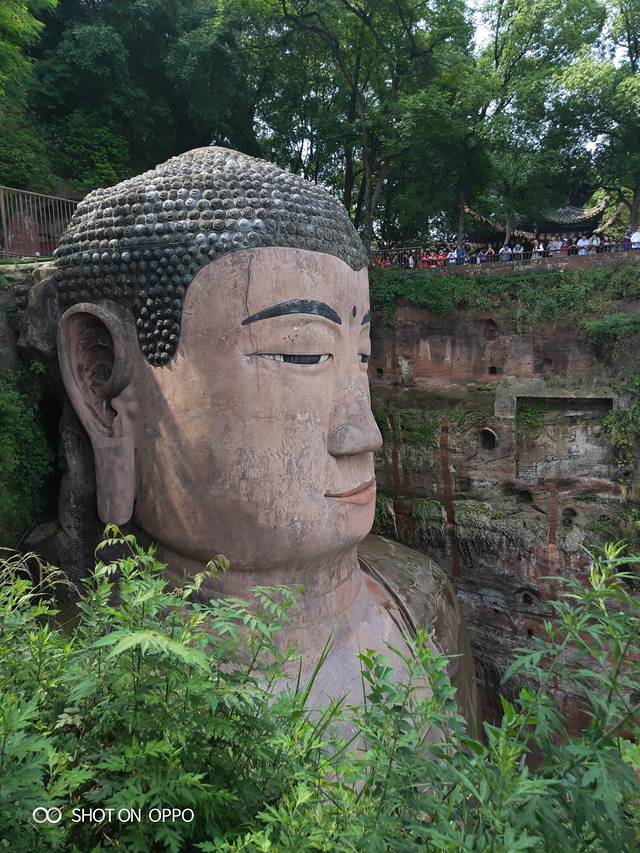 从苏东坡写的佛字进去,往右边走333个台阶,到凌云寺,就看到大佛的头部了。