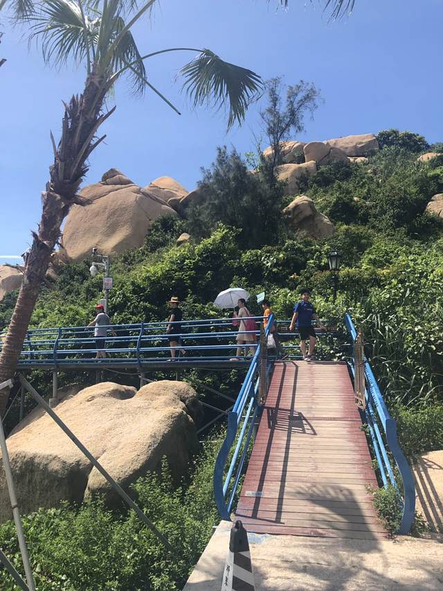 进入景区,首先是几个大的露天泳池,很多游客带小孩在这玩水,泳池后面是大海,我们随行有5个小孩,看到后,都欢呼不已,再也挪不动脚,欢呼着要下水,留下一个伙伴照顾小孩后,我们开始沿海滨栈道,游玩
