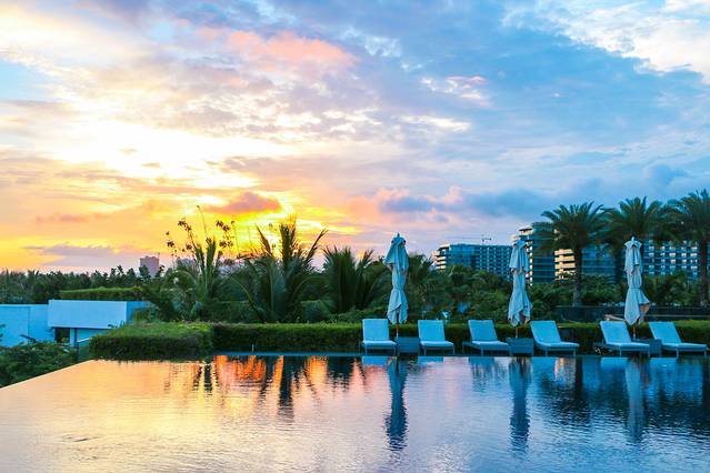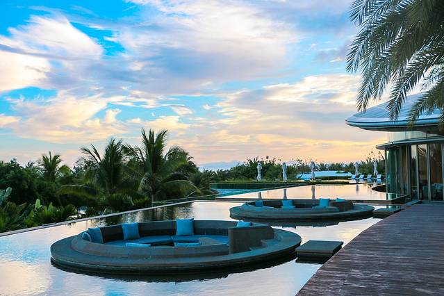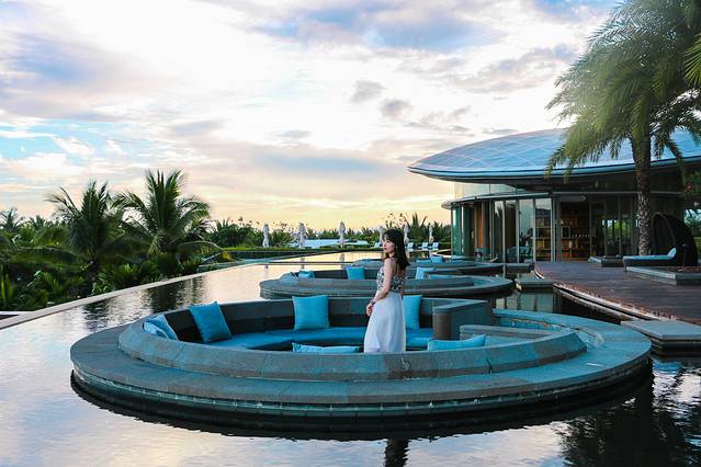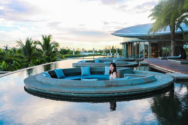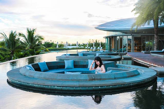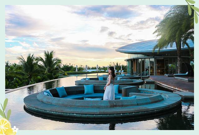 好喜欢这个“棉花堡”般的泳池,中午时好像把三亚的阳光都凝聚了在一起,闪闪发亮的自带仙气~但是已到了夜晚,这里变幻成一个酷炫的泳池party。
