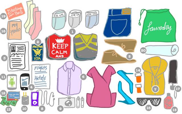 旅行小物:相关证件/ 眼罩 / 墨镜 / 充电器 / 面膜 / 护发素 / 风油精 / 创可贴 / 拖鞋 / 毛巾 / 纸笔 / 指甲刀 / 驱蚊水 / 湿巾 /保温杯 /隐形眼镜和护理液 / 洗漱用品