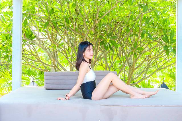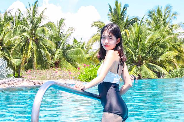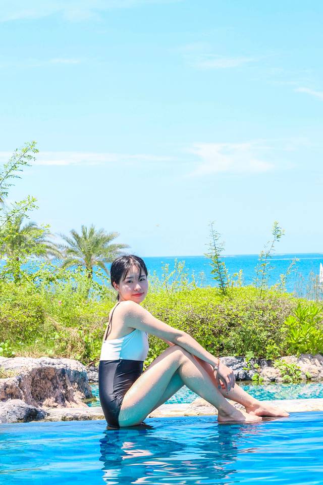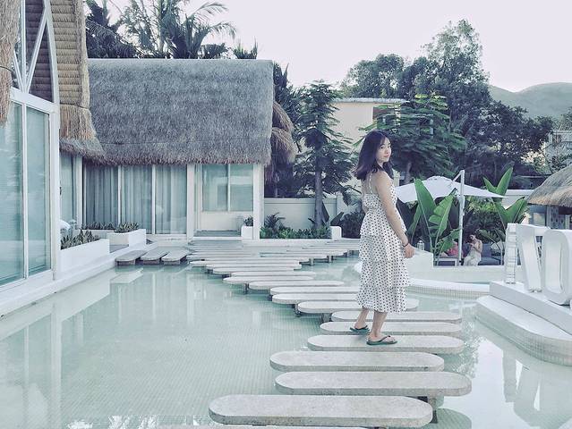 早晨醒过来,被泳池边上的嬉闹声所惊醒,跑到阳台一看,快要进入雨季的三亚这几天天气都是阴晴不定,而今天放了一个大好晴天。许多女孩子都穿着泳衣到泳池边上齐齐摆pose,趁着大好的阳光,来泳池上自己拍写真。