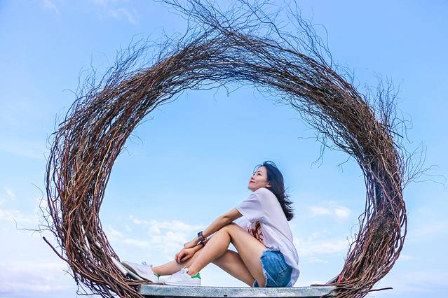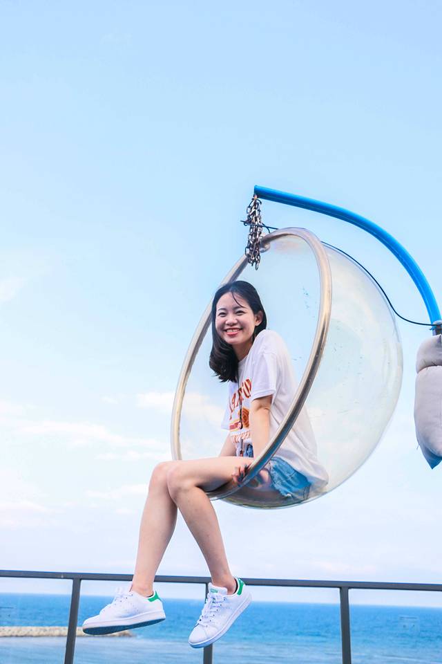 坐上玻璃球就好像坐上了摇摇晃晃的秋千,看着碧海蓝天,身体随着惯性的摆动,也把浪漫的夏天绕成圆圈圈。都说女孩子幻想住进玻璃球里,开始我还不信,然后自己在玻璃球里拍照后,回头看照片发现自己露出好灿烂的笑容。