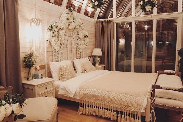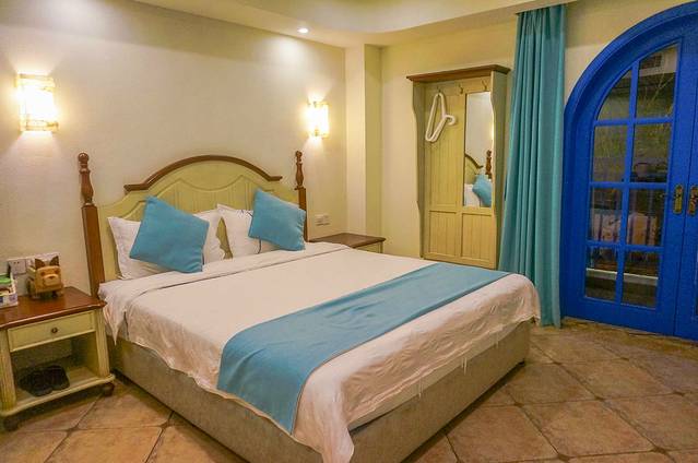 茅草房的装修风格很别致,进来茅草屋就感受到了一种摩洛哥式的异域风情,三面都是落地窗,屋内有许多鲜花点缀,有的绽放在墙壁上,有的吊挂在屋顶,十分喜欢这件复古而华丽优雅的房间。