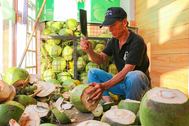 进了店门口,左边的区域椰子堆成了个小山,我好奇地问了师傅每天大约要砍多少个椰子,师傅说每天要现砍100多个椰子,原来嗲嗲的椰子鸡采的是东郊椰林的新鲜椰子,每天都是现采现摘运到三亚的店里,师傅看我很感兴趣,于是拿起大刀子,现场给我展示了下如何快准狠地劈椰子。
