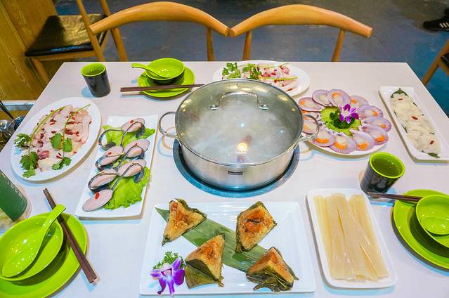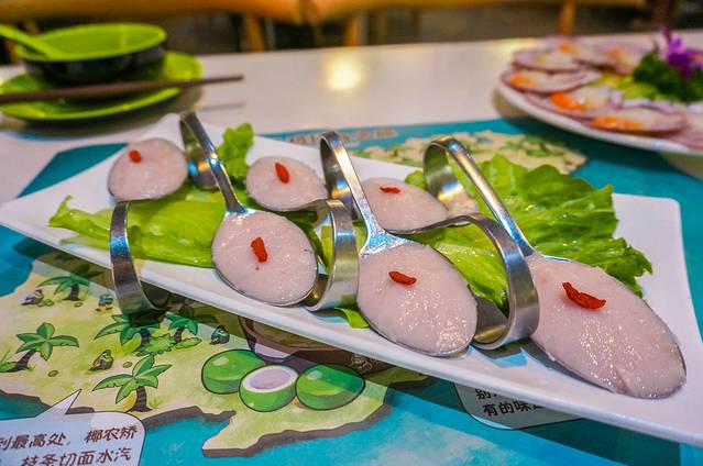 嗲嗲手打马鲛鱼滑也是特色菜之一,一分钟的时间就可以品尝到它的香润甜滑,但我的关注点已经被它的勺子吸引去了,原来这是为了方便挂在火锅壁上而专门设计的。