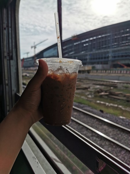在车上,还买了杯冰咖啡,10铢,一路就这么吹着风,喝着咖啡,听着旁边大妈大爷们聊天,经过一个多小时,中午到达阿育塔亚站。要留意的是,火车晚点开很正常,前几站都在 曼谷 ,车速也很慢,周围也没啥好看的!出了廊曼机场附近那个站,车速才稍微快起来,不然,看着旁边高速上的汽车,你真的不会觉得自己在坐火车!